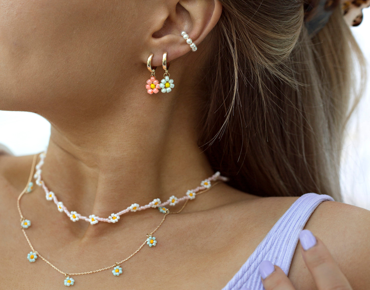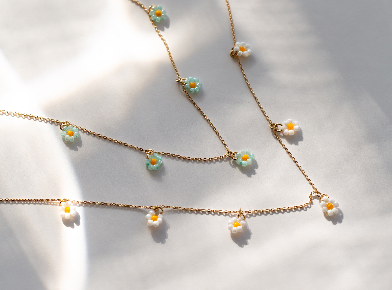 Dieser pastellfarbene Gänseblümchen-Perlenschmuck wird eine wunderschöne Ergänzung für Ihren Sommerlook sein.