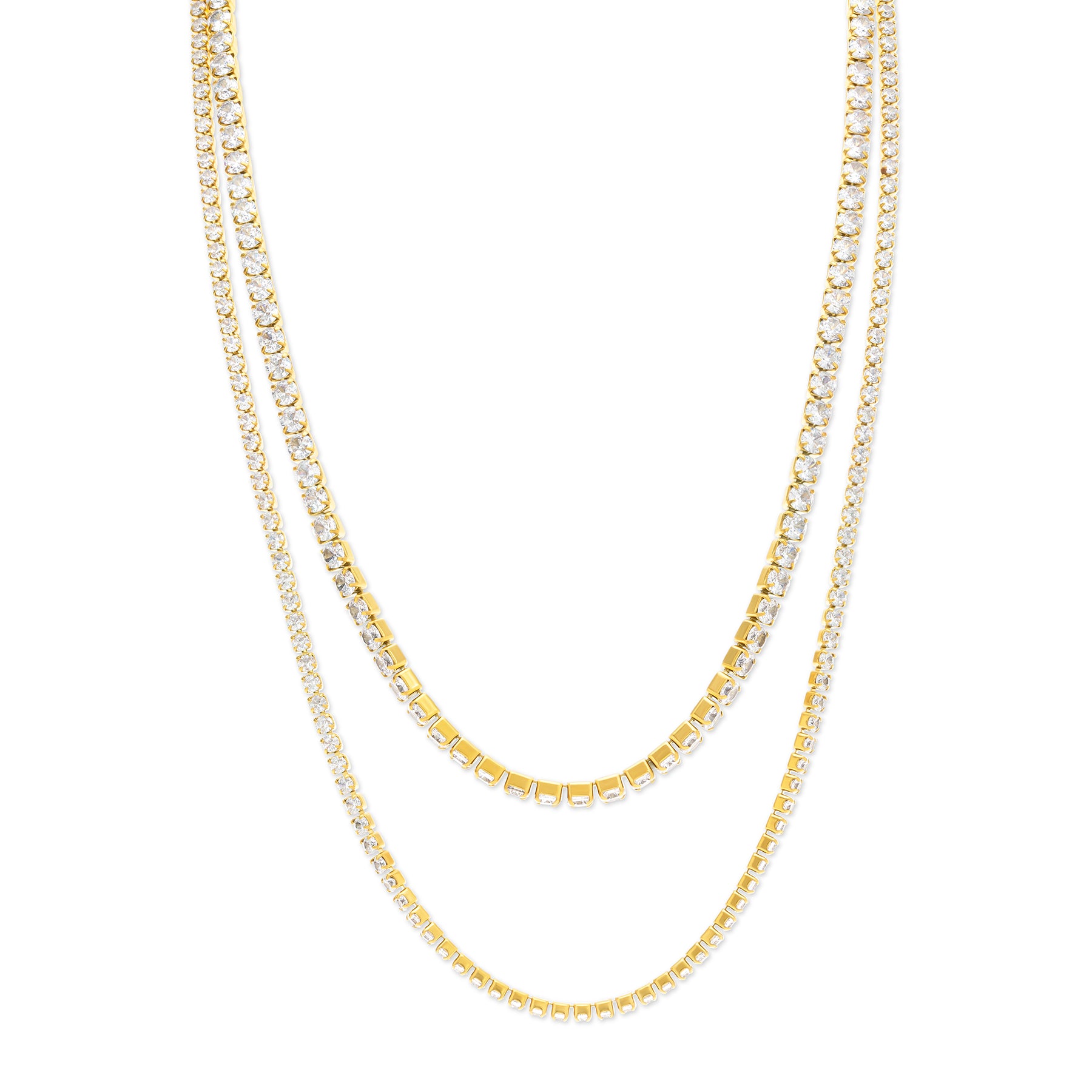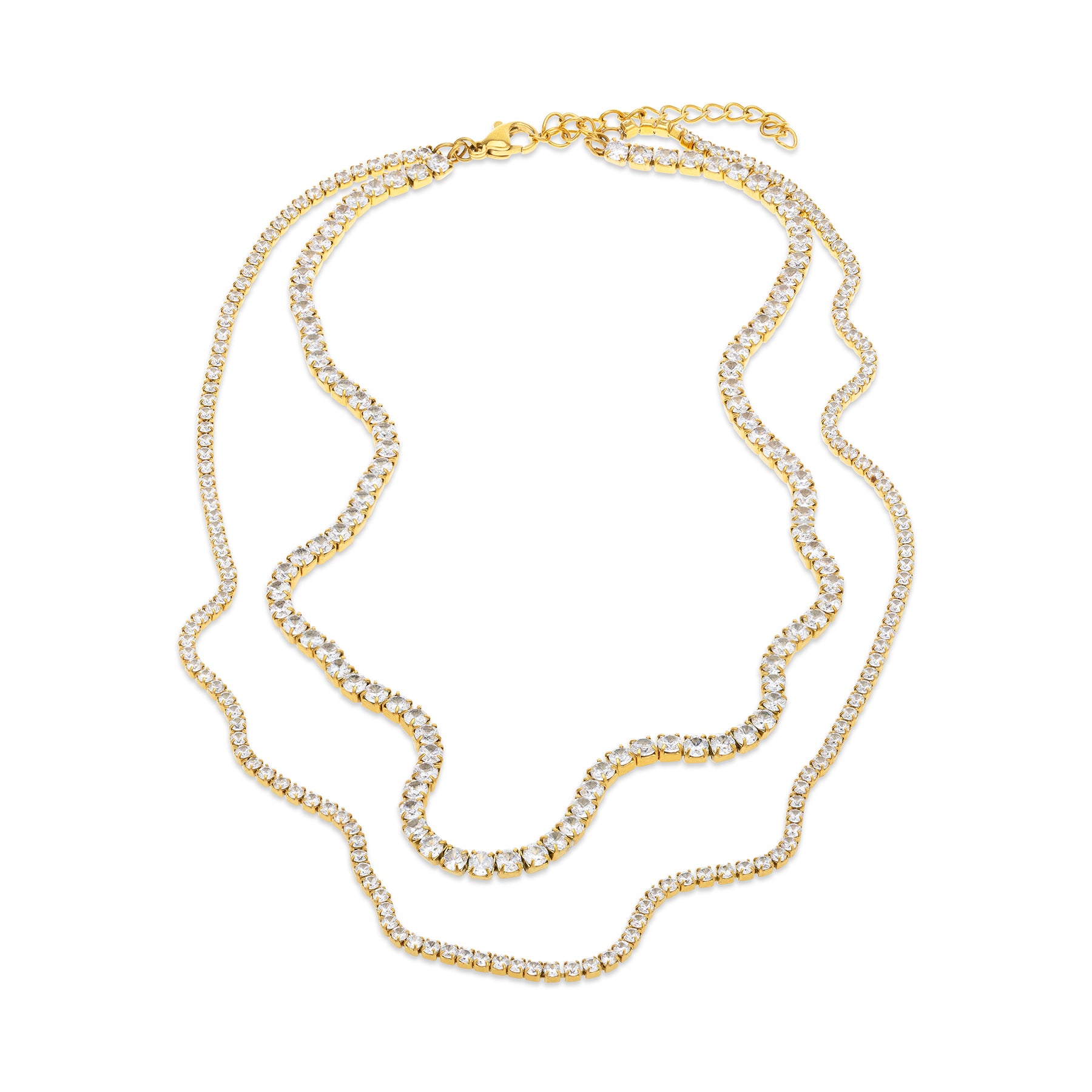 Dezentes Funkeln mit dieser Kristall-Halskette. Diese zarte Edelstahl-Halskette besteht aus zwei kristallverzierten Ketten, die an ein Tennisarmband erinnern. Sie ist wasserfest und anlaufgeschützt und sorgt für raffinierte Eleganz.